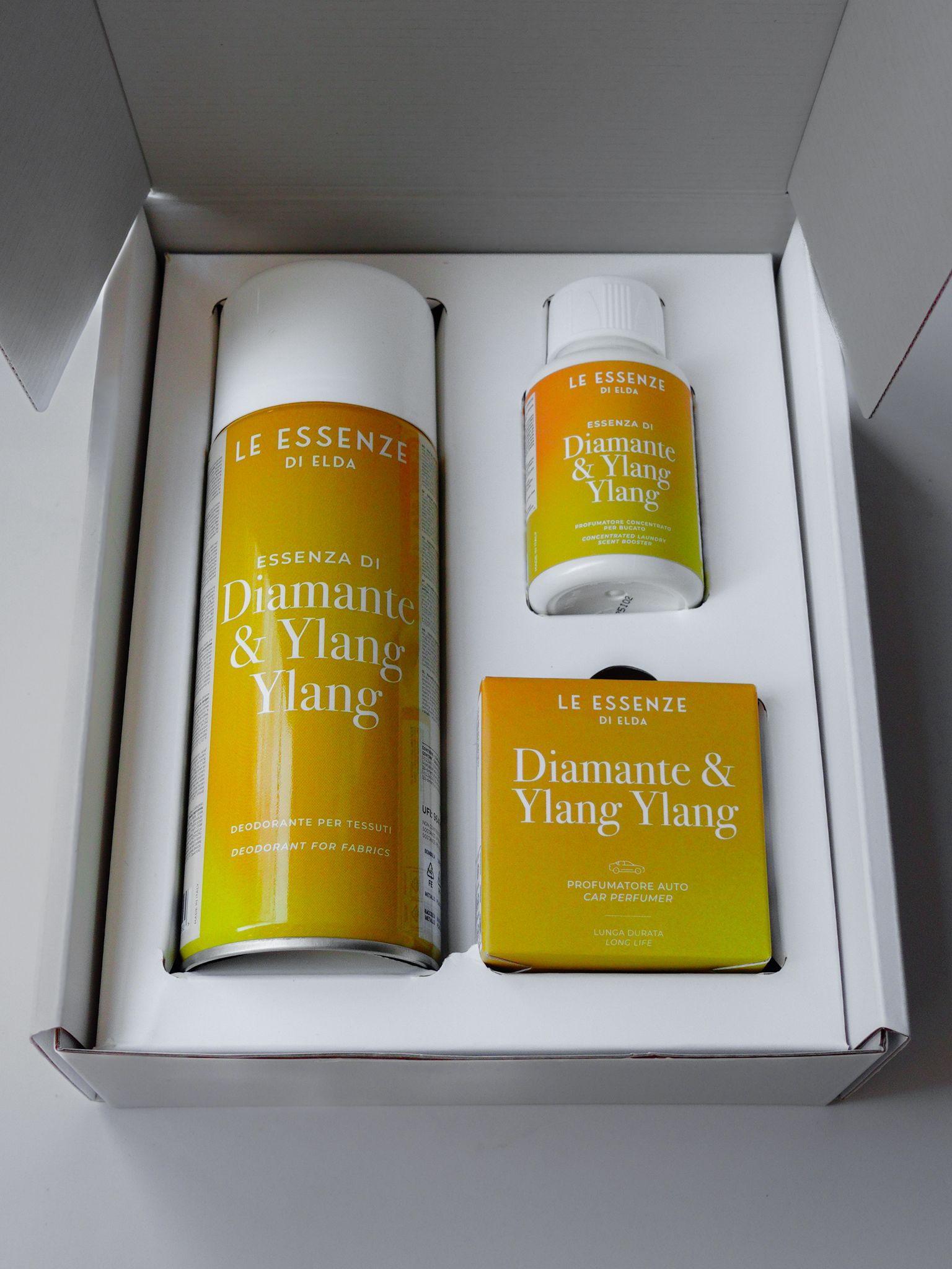 Ontdek deze prachtig samengestelde box met een verfijnde combinatie van een 100 ml wasparfum, autoparfum en een heerlijke textielspray – perfect om kleding, linnengoed en elke ruimte een heerlijke, frisse geur te geven.